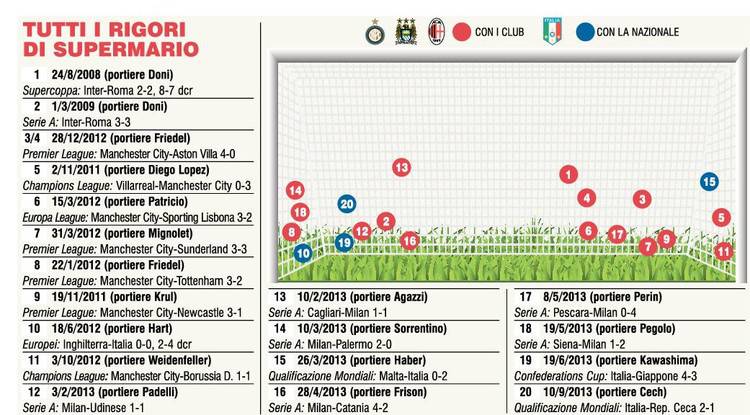 BALOTELLI RIGORI – Nella sfida fra l’Italia e la Repubblica Ceca di martedì sera, Super Mario Balotelli ha trasformato il suo ventesimo rigore su 20 battuti in carriera. Un vero e proprio cecchino il bomber del Milan, che fanno lo stesso uno degli specialisti più forti dagli 11 metri, se non il più forte in assoluto, non solo dei calciatori in circolazione ma dell’intera storia del calcio. La redazione de il Corriere dello Sport, tramite apposita grafica, ha evidenziato tutti i 20 tiri dal dischetto di Super Mario, individuando dove questi sono stati battuti.