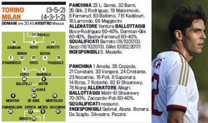 TORINO MILAN PROBABILI FORMAZIONI – Poco più in basso troverete le probabili formazioni di Torino-Milan firmate Gazzetta dello Sport. Risolto il rebus sulla fascia destra che dovrebbe essere presenziata da Zaccardo visto il doppio infortunio di De Sciglio e Abate. Niente da fare per Poli ed El Shaarawy, entrambi in panchina, mentre in attacco ci sarà Balotelli affiancato da Matri con Kakà sulla trequarti alla prima da titolare nel Milan da quando è tornato. Sulla sinistra spazio ad Emanuelson, e infine Zapata e Mexes a completare la retroguardia.