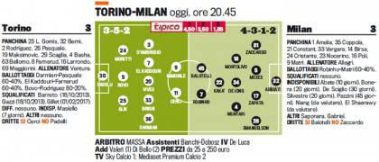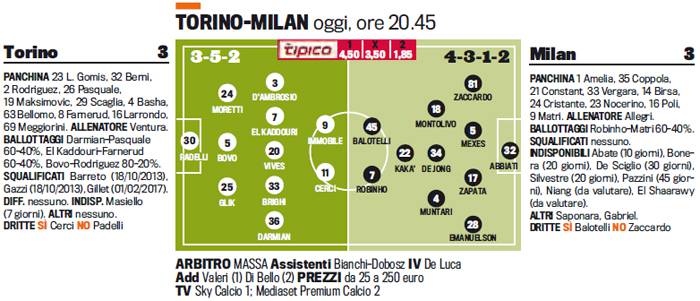 TORINO MILAN PROBABILI FORMAZIONI – Alle ore 20.45 di questa sera il Milan torna in campo. Allo stadio Olimpico di Torino affronterà i Granata di Ventura, padroni di casa. Allegri dovrà fare a meno di El Shaarawy, out per un problema muscolare, nonché di De Sciglio, Abate, Silvestre, Pazzini, Niang e Bonera. In attacco spazio a Kakà dal primo minuto, dietro a Balotelli e Robinho. Il brasiliano sembra in vantaggio su Matri e corre verso una maglia da titolare. In difesa Zaccardo andrà a destra mentre sulla sinistra spazio a Emanuelson. A centrocampo, infine, Muntari vince il ballottaggio con Poli.