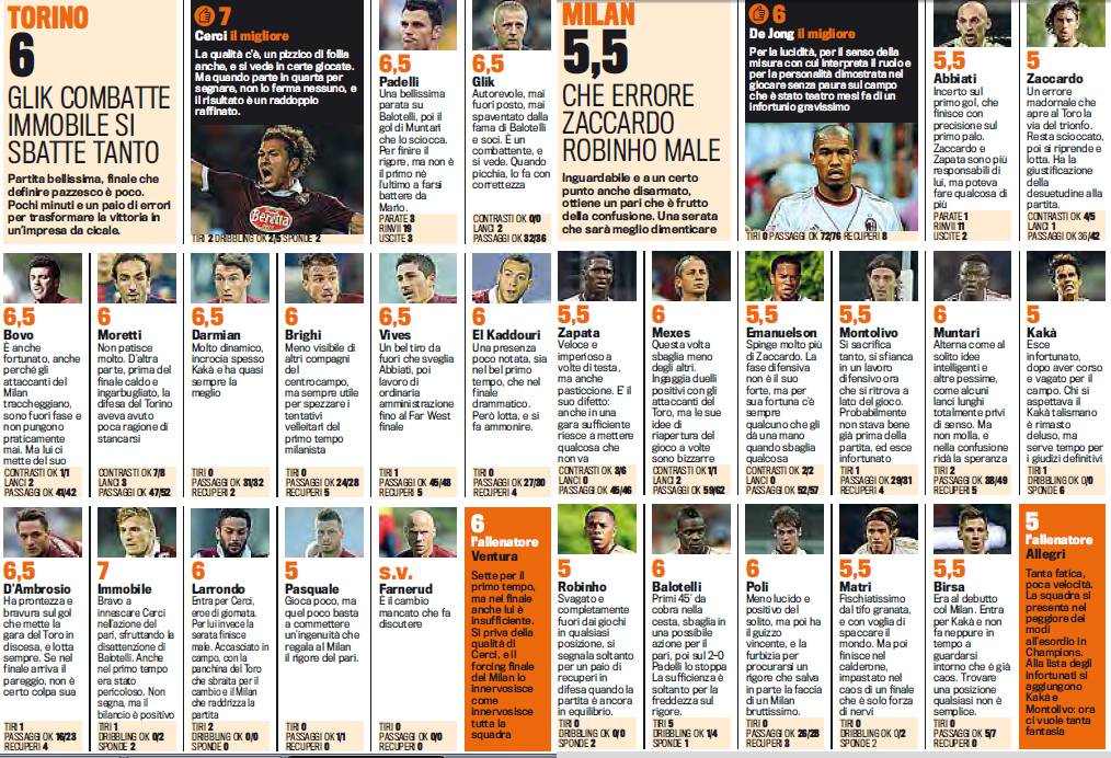 TORINO MILAN VOTI PAGELLE GAZZETTA DELLO SPORT – Pubblichiamo i voti e le pagelle Gazzetta dello Sport di Torino-Milan, gara giocatasi ieri sera allo stadio Olimpico e conclusasi con il risultato di parità per 2 a 2. Partita rocambolesca quella dei rossoneri che dopo essere andati in svantaggio di due gol hanno acciuffato il pari allo scadere, grazie al rigore di Balotelli. Solo 5 sufficienze per il Milan: oltre a Balotelli anche Poli, Mexes, De Jong e Muntari. Male Zaccardo, mentre da rodare Kakà, ancora lontano dalla forma fisica perfetta.