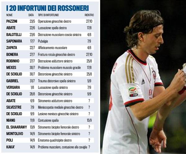 MILAN ELENCO INFORTUNI – E’ una vera e propria emergenza infortuni in casa Milan. Dallo scorso mese di maggio, da quando cioè è finita la stagione 2012-2013, ad oggi, in quel di Milanello si sono registrati ben 20 stop. Ha iniziato Pazzini, con l’operazione al ginocchio dello scorso 23 maggio, ed hanno chiuso Montolivo e Poli (con il dubbio Kakà), i cui tempi di recupero dovranno essere accertati nelle prossime ore. In questa pagina trovate i 20 infortunati rossoneri, elenco stilato stamane dal quotidiano Tuttosport.