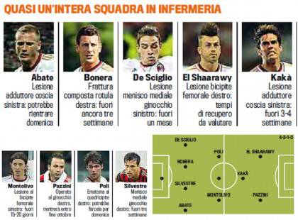 MILAN INFORTUNI – C’è un 4-3-1-2 rossonero fermo ai box, in infermeria. In casa Milan Allegri deve fare i conti con una serie infinita di infortunati, tra cui alcuni giocatori basilari per il gioco rossonero. La Gazzetta dello Sport, stamane, ha stilato una formazione composta da solo acciaccati, realizzando un 4-3-1-2 di tutto rispetto: Gabriel in porta (anche se il portiere sembra ormai arruolabile), De Sciglio e Abate sulle fasce, Silvestre e Bonera al centro; a centrocampo Montolivo e Poli (manca un terzo centrocampista), con Kakà dietro alle punte. Infine l’attacco con El Shaarawy e Pazzini. Più forte l’11 acciaccato o quello che scenderà in campo domani sera contro il Celtic?