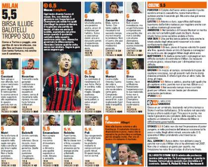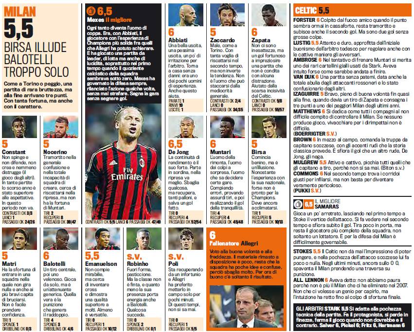 MILAN CELTIC VOTI PAGELLE GAZZETTA SPORT – In questa pagina troverete i voti e le pagelle Gazzetta dello Sport di Milan-Celtic, sfida valevole per il primo turno di Champions League e conclusasi con il risultato di 2 a 0 in favore dei rossoneri. Man of the match secondo la Rosa assegnato a Philippe Mexes, sicuro come non mai nella sfida contro gli scozzesi. Nessun lampo per Balotelli (voto 6), mentre Birsa e Matri, i due osservati speciali del match, deludono le attese: per entrambi voto 5.