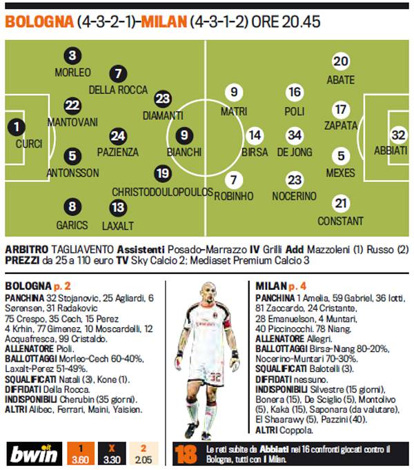 BOLOGNA MILAN PROBABILI FORMAZIONI – Eccovi le probabili formazioni di Bologna-Milan, sfida che si giocherà questa sera alle ore 20.45 in quel dello stadio Dall’Ara di Bologna. Allegri in emergenza per via degli infortunati e della squalifica di Balotelli. In attacco dovrebbe giocare la coppia Matri-Robinho con Birsa sulla trequarti. A centrocampo probabile turno di riposo per Muntari, al suo posto Nocerino. In difesa si rivede Constant dal primo minuto sulla sinistra dopo la disastrosa prova di Emanuelson contro il Napoli. Resto dell’11 come da ultime uscite. (Fonte foto: La Gazzetta dello Sport).