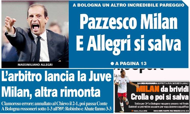 Home » Milan News » I titoli Gazzetta, CorSport e Tuttosport: Pazzesco Milan da brividi, Allegri si salva, l’arbitro lancia la Juve – Foto