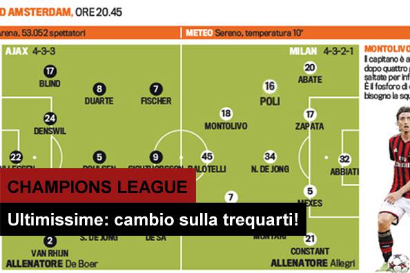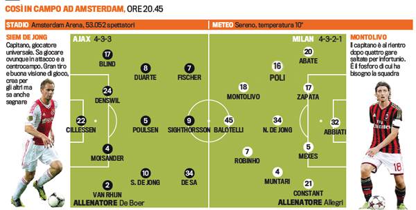 AJAX MILAN ULTIMISSIME FORMAZIONI – Cambio nell’11 rossonero che questa sera scenderà in campo contro l’Ajax. Allegri starebbe infatti pensando di lasciare in panchina Birsa in favore di Montolivo. L’ex Fiorentina agirà quindi sulla trequarti e al posto di quest’ultimo dentro Poli sull’interno di destra. Resta da capire se il modulo sarà un 4-3-1-2 o il noto albero di Natale.