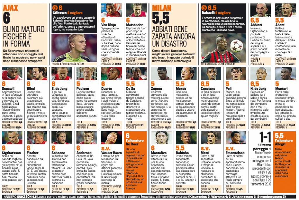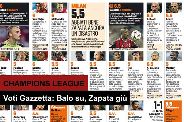 AJAX MILAN VOTI PAGELLE GAZZETTA DELLO SPORT – In questa notizia troverete allegati i voti e le pagelle Gazzetta dello Sport di Ajax-Milan, gara giocatasi ieri sera, valevole per il secondo turno dei gironi di Champions League, e conclusasi con il risultato di 1 a 1, in perfetta parità. Migliori in campo Balotelli, De Jong e Abbiati. Male invece Zapata, così come Andrea Poli, quest’ultimo di solito fra i migliori ma ieri sera un po’ sottotono. Non bene anche Muntari mentre Constant registra una buona prova.