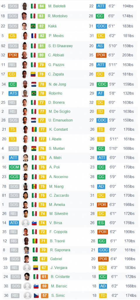 FIFA 14 BALOTELLI SIMIC – Quanti di voi hanno preso Fifa 14? Probabilmente moltissimi e non ce ne vorranno gli amanti di PES 2014 se dedicheremo un po’ di spazio al gioco targato EA Sports. Cercando in rete abbiamo infatti scovato tutti i valori del calciatori rossoneri, mettendoli in ordine dal più forte (Balotelli), al più debole (il Primavera Simic). Eccoli di seguito: siete d’accordo con questa graduazione?