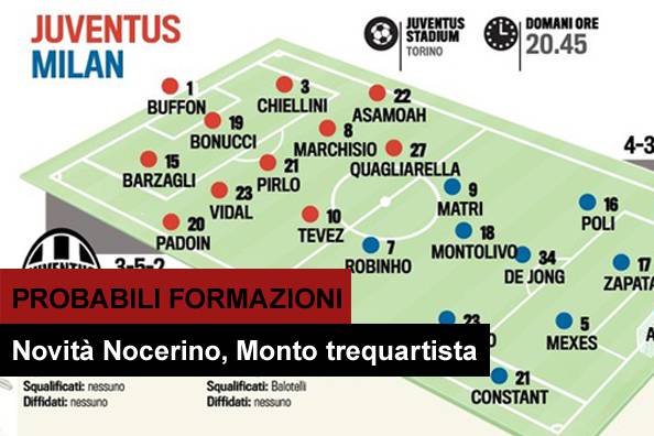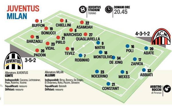 JUVENTUS MILAN PROBABILI FORMAZIONI – Eccovi le probabili formazioni di Juventus-Milan, sfida che si giocherà domani sera allo Juventus Stadium alle ore 20.45. Allegri alle prese con la solita emergenza infortuni manderà in campo un 4-3-1-2 con Montolivo trequartista alle spalle di Robinho e Matri. A centrocampo possibile novità Nocerino al posto di Muntari, spalleggiato dal solito De Jong e da Poli. In difesa, Mexes e Zapata centrali con Constant e Abate sulle corsie. In casa Juve novità Padoin sulla destra (al posto dell’infortunato Lichtsteiner) mentre in attacco Tevez sarà spalleggiato da Quagliarella (Vucinic è out). (Fonte foto: Tuttosport)