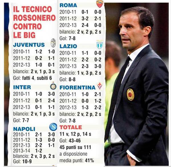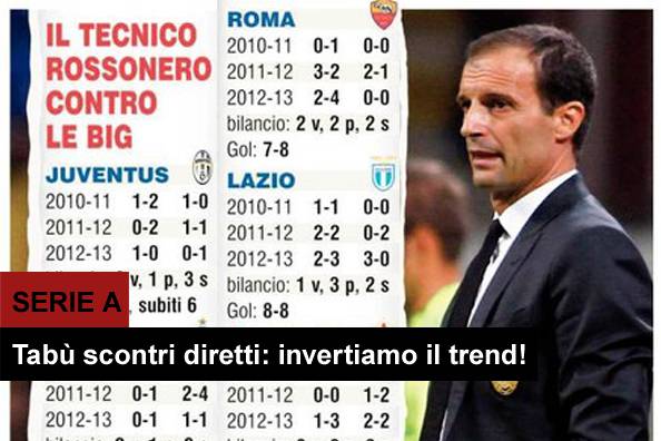 MILAN TABU’ SCONTRI DIRETTI – Sono un vero e proprio tabù gli scontri diretti per il Milan di Massimiliano Allegri. Come sottolineato stamane dal Corriere dello Sport con apposita grafica, il Diavolo ha ottenuto 24 punti su 36 durante la stagione dello scudetto (il primo anno di Allegri), invertendo però clamorosamente in trend nelle due annate successive durante le quali i rossoneri hanno totalizzato solamente 21 punti su 72 totali, una percentuale misera del 30%. La stagione da poco iniziata sta confermando questo trend negativo con la sconfitta interna contro il Napoli: domani sera sarà la volta buona per invertirlo?