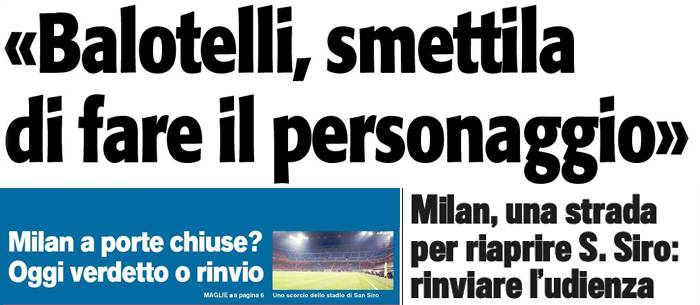 Home » Milan News » I titoli Gazzetta, CorSport e Tuttosport: “Balotelli smetta di fare il personaggio”, San Siro riapre? – Foto
