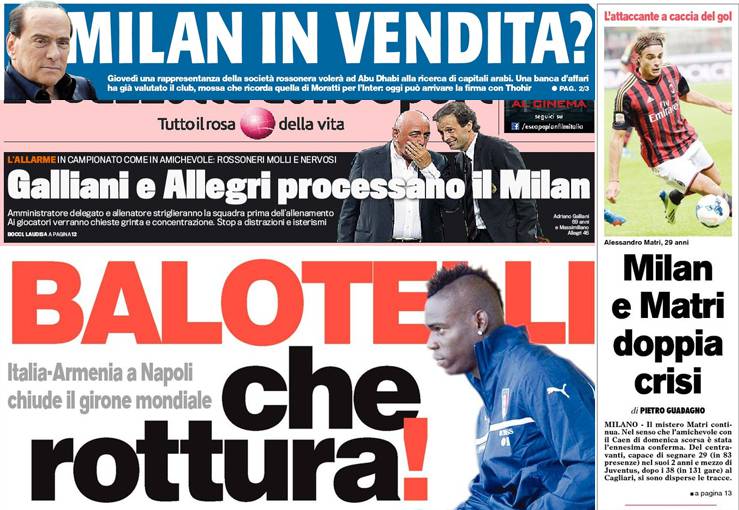 Home » Milan News » I titoli Gazzetta, CorSport e Tuttosport: Milan in vendita? Processo al Milan, Balo e Matri… – Foto
