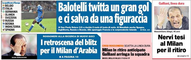 Home » Milan News » I titoli Gazzetta, CorSport e Tuttosport: Balotelli ci salva, blitz in Arabia, furia Galliani – Foto