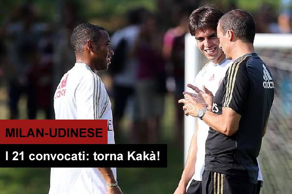 MILAN UDINESE CONVOCATI – Sono stati diramati poco fa i convocati del Milan in vista della sfida contro l’Udinese. Si rivede finalmente Kakà che potrebbe scendere in campo nella ripresa domani sera. Ecco l’elenco completo: Abbiati, Amelia, Gabriel, Abate, Constant, Silvestre, Vergara, Zaccardo, Zapata, Birsa, Cristante, Emanuelson, Kakà, Montolivo, Muntari, Nocerino, Poli, Saponara, Matri, Niang e Robinho.