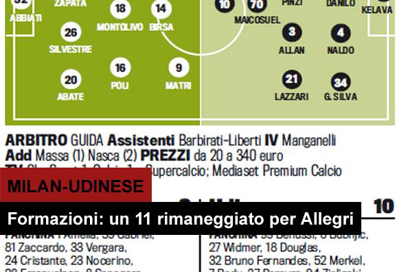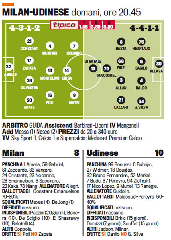 MILAN UDINESE PROBABILI FORMAZIONI – Il Milan scenderà in campo domani sera per il posticipo di sabato dell’ottava giornata di Serie A. A San Siro giungerà l’Udinese e Allegri dovrà fare i salti mortali per allestire un 11 degno del Milan. Fra squalificati e infortunati il Conte Max dovrà fare a meno di pezzi pregiati, per ultimo, Balotelli. Grandi novità sono attese domani a cominciare da Silvestre che sembra aver vinto il ballottaggio con Bonera e che stazionerà al fianco di Zapata. A centrocampo assente De Jong per squalifica, spazio al trio Montolivo, Muntari e Poli. Infine l’attacco con Birsa favorito su Kakà dietro al duo obbligato Robinho-Matri.
