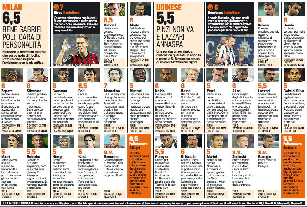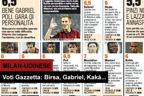 MILAN UDINESE VOTI PAGELLE GAZZETTA DELLO SPORT – In questa pagina troverete i voti e le pagelle Gazzetta dello Sport di Milan-Udinese, gara che si è giocata ieri sera allo stadio San Siro, e che si è conclusa con il risultato di 1 a 0 in favore dei rossoneri. Molto bene Valter Birsa, il migliore in campo, e ancora una volta decisivo con un suo gol. Grande prestazione anche di Riccardo Montolivo, altra nota molto positiva della serata. Ricardo Kakà riabbraccia San Siro dopo 1600 giorni, per lui solo 15 minuti, ma la Gazzetta lo premia comunque con un 6. Infine, molto bene Gabriel, alla prima da titolare nel Milan in Serie A e autore di un’ottima partita.