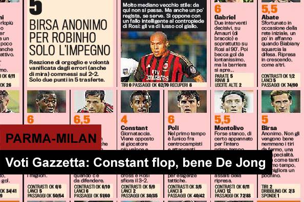PARMA MILAN VOTI PAGELLE GAZZETTA DELLO SPORT – Pubblichiamo i voti e le pagelle di Parma-Milan firmati Gazzetta dello Sport. La Rosa boccia i rossoneri a cominciare da Kevin Constant, il peggiore in assoluto in campo ieri (voto 4). Molto male anche Balotelli, sostituito a fine primo tempo, troppo nervoso e mai incisivo. Si salva invece il solito Nigel De Jong, il migliore del Milan (voto 7), e all’ennesima ottima prestazione in serie. Bene Matri, al primo gol con la casacca del Milan, mentre voto 6 per Kakà.