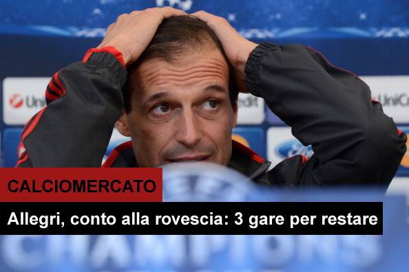 CALCIOMERCATO MILAN – Ancora tre gare poi si capirà se Massimiliano Allegri sarà l’allenatore del Milan per il resto della stagione. Il Conte Max non deve sbagliare contro Lazio, Fiorentina e infine Barcellona, altrimenti potrebbe scattare l’esonero con la panchina affidata ad una soluzione interna (Inzaghi o Galli-Tassotti). Il Milan deve quindi svoltare nei prossimi 270 minuti, dopo un inizio di stagione negativo, un po’ meglio rispetto allo scorso anno, ma comunque al di sotto delle attese. A salvare Allegri è il buon cammino in Champions League, con una vittoria, il pareggio ad Amsterdam e il buon pari interno contro il Barcellona. Berlusconi è infuriato, e servirà quindi una svolta, bisognerà assolutamente raddrizzare la stagione a cominciare dalla doppia sfida contro Lazio e Fiorentina, due rivali dirette per la corsa all’Europa: il Conte Max ce la farà anche questa volta?