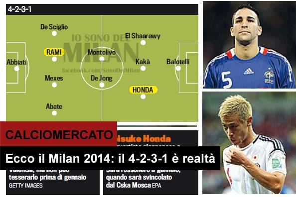 CALCIOMERCATO MILAN – Giungono nuove conferme circa la possibilità che a partire dal prossimo gennaio il Milan possa volgere definitivamente al 4-2-3-1. Abbandonata l’idea del 4-3-1-2 e rispolverato il 4-3-3, Allegri ha utilizzato nel finale del match col Parma il modulo tanto di moda in Europa, con Matri unica punta e a supporto i vari centrocampisti offensivi. Uno schema che sarà fattibile grazie soprattutto all’arrivo di Honda che permetterà ad Allegri di disporre di un parco di attaccanti davvero di prima fascia. L’idea, caldeggiata fortemente anche da La Gazzetta dello Sport stamane, vede Balotelli nel ruolo di prima punta supportato dal trio El Shaarawy, Honda e Kakà: come vi sembra questo modulo?