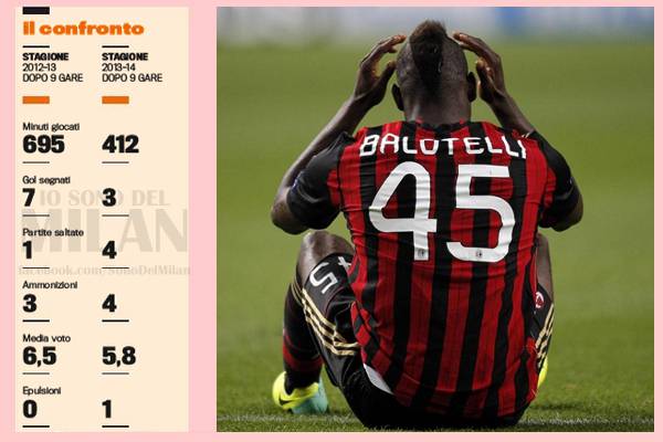 MILAN CERCASI VERO BALOTELLI – L’inizio di stagione di Super Mario Balotelli non è stato come ci si attendeva e lo testimonia le statistiche dello stesso attaccante del Milan. Come sottolineato stamane da La Gazzetta dello Sport, il bomber rossonero dopo 9 gare giocate in questo primo 2013-2014, ha segnato 3 gol, tenuto una media di 5,88, subito un’espulsione, 4 ammonizioni e saltato ben 4 gare. Nelle prime 9 uscite con il Milan da gennaio 2013, i numeri erano invece ben diversi: al di la del fatto che su 9 match ne ha giocati 8 (contro i 5 attuali), Mario ha totalizzato 7 marcature non venendo mai espulso e tenendo una media di 6,5 a partita. Super Mario deve ritrovarsi: solo così il Milan può tornare grande.