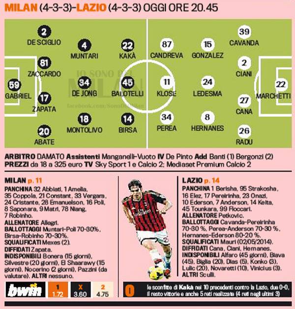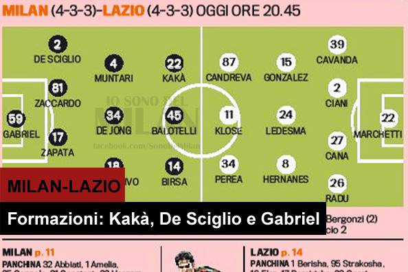 MILAN LAZIO PROBABILI FORMAZIONI – Eccovi le probabili formazioni di Milan-Lazio, gara che si giocherà questa sera alle ore 20.45, valevole per il turno infrasettimanale della Serie A, il decimo. Allegri si affida a Kakà che torna titolare dopo la panchina contro il Parma, e che partirà al fianco di Balotelli e Birsa nel 4-3-3. In porta confermato Gabriel nonostante il ritorno di Abbiati mentre si vede per la prima volta da titolare De Sciglio, finalmente abile e arruolabile. Ancora out Mexes per squalifica al suo posto ci sarà Zaccardo. (Fonte foto: Gazzetta dello Sport)