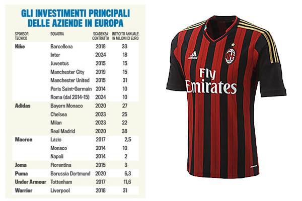 SPONSOR TECNICO MILAN – Il Milan è la squadra italiana con l’ingaggio più alto relativamente allo sponsor tecnico. La partnership con Adidas frutta infatti circa 22 milioni di euro alla squadra di via Turati. Più in basso troviamo invece la Juventus e l’Inter, ferme rispettivamente a quota 18 e 15 con Nike. Cifre importanti ma il divario è netto rispetto alle altre grandi d’Europa a cominciare dal Real Madrid, che prende ben 38 milioni da Adidas e dal Barcellona, che percepisce ben 33 milioni di euro dalla Nike.