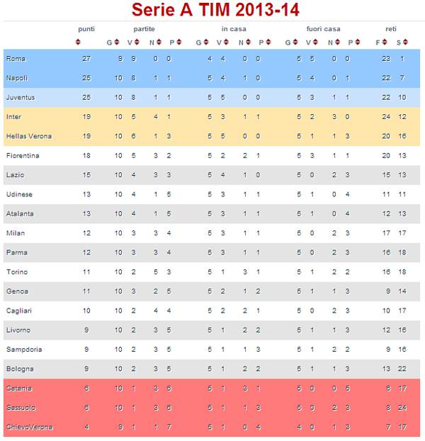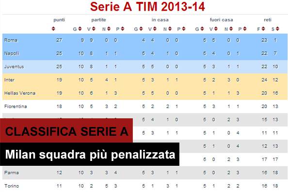 CLASSIFICA SERIE A – Panorama.it ha aggiornato la classifica di Serie A dopo la decima giornata giocatasi ieri, al netto dei favori/torti arbitrali. Ancora una volta, Milan squadra più penalizzata, con ben 6 punti in meno rispetto a quelli che dovrebbe realmente avere. Ieri c’è stato un mancato rigore dopo contatto Cavanda-Balotelli che avrebbe potuto cambiare le sorti del match. Squadra più favorita invece è il Napoli, che gode di un vantaggio di 6 punti. (In foto la classifica reale)