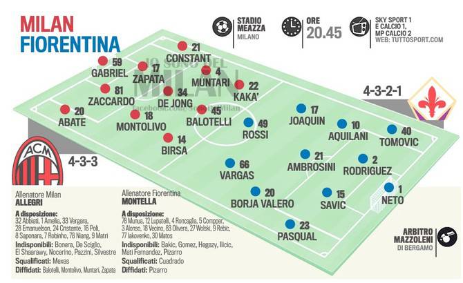 MILAN FIORENTINA FORMAZIONI – Eccovi le probabili formazioni di Milan-Fiorentina, gara che si giocherà questa sera alle ore 20.45, valida per l’undicesima giornata di Serie A. Allegri dovrà fare a meno di De Sciglio, il cui ginocchio operato è tornato a farsi sentire. Al suo posto giocherà a Constant. Confermato Kakà dal primo minuto al fianco di Birsa e Balotelli. A centrocampo sembra favorito Muntari su Poli visto che il Conte Max vorrebbe un giocatore di maggiore contenimento e d’esperienza rispetto all’ex Sampdoria. (Fonte foto: Tuttosport)
