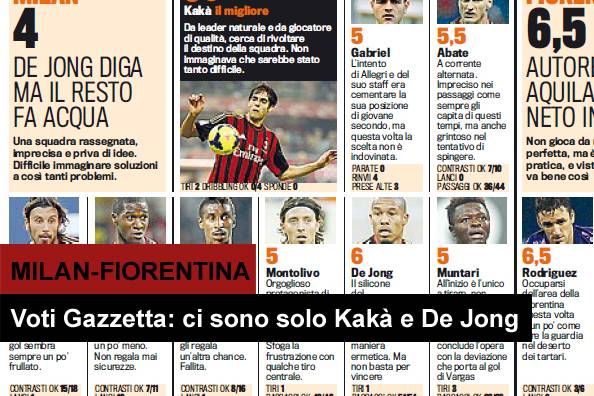 MILAN FIORENTINA VOTI GAZZETTA – Pubblichiamo i voti e le pagelle Gazzetta dello Sport di Milan-Fiorentina. La sfida di San Siro, giocatasi ieri sera alle ore 20.45, è terminata con il risultato di 2 a 0 in favore della Viola. Malissimo il Milan ad eccezione di Kakà e De Jong, gli unici due che provano a tenere alto il nome della squadra. Peggiore in campo è Balotelli, voto 4, letteralmente disarmante ed irritante, più a terra che vicino alla porta per cercare il gol. Male anche Gabriel, voto 5 per lui, così come il resto dell’11 rossonero, tutti al di sotto della sufficienza.