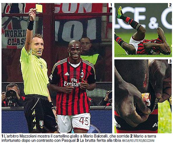 MILAN FIORENTINA – Una serataccia davvero da dimenticare per Balotelli quella vissuta ieri. In occasione della sfida contro la Fiorentina, Super Mario è stato il peggiore in campo, bocciato dalla Rosa e dai quotidiani sportivi con un 4 in pagella. Una prova resa ancora più negativa dall’ammonizione inutile dopo spintone a Neto, che obbligherà il Milan a giocare senza Super Mario la prossima sfida, perchè squalificato. Super Mario ha poi subito l’ennesimo fallaccio, come testimonia la foto pubblicata stamane dalla Rosa, in cui si evidenzia una profonda ferita alla tibia dopo scontro di gioco. Balotelli deve cambiare registro, altrimenti nelle prossime settimane tutto potrebbe succedere…