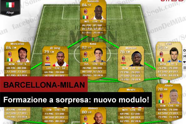 BARCELLONA MILAN FORMAZIONI – Nuovo cambio modulo in casa Milan in vista della sfida di domani sera contro il Barcellona. Stando a quanto raccoglie Sky Sport 24, Allegri sembra intenzionato a schierare un inedito 4-4-1-1, inserendo Poli a centrocampo per dar man forte assieme a Muntari, De Jong e Montolivo. In attacco, invece, Balotelli farà da prima punta con Kakà subito alle sue spalle. Cosa ne pensate di questa nuova disposizione tattica?