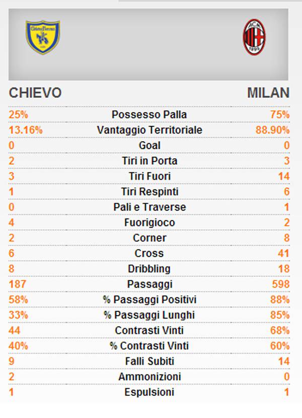 CHIEVO MILAN STATISTICHE – Eccovi le statistiche di Chievo-Milan riportate da Gazzetta.it. I rossoneri hanno dominato nel possesso palla, ben il 75%, ma l’attacco del Diavolo è stato completamente sballato, con ben 14 tiri fuori dall’area. Si aggiunge un palo (colpito da Robinho), l’espulsione di Montolivo per doppia ammonizione e l’88% di passaggi riusciti. Infine, da segnalare gli 8 corner battuti mai sfruttati però dai rossoneri.