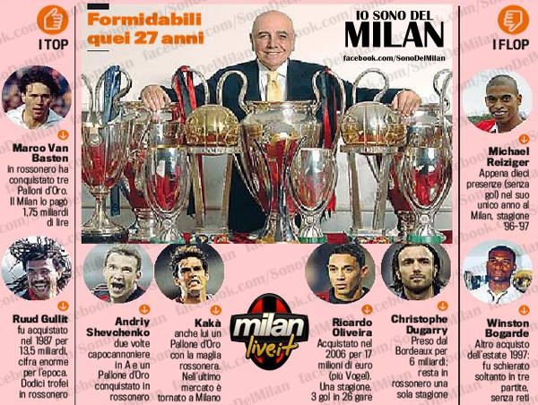TOP FLOP GALLIANI – Quali sono i colpi migliori di Galliani e quali i peggiori? Per individuarli ci aiutiamo con La Gazzetta dello Sport in edicola stamane, che ha cercato di sintetizzare i colpi dello storico ad rossonero, prossimo all’adddio al Milan, che hanno segnato in positivo o in negativo un’epoca. Fra le perle troviamo i tre olandesi, ma anche il duo Shevchenko-Kakà. Fra i colpi peggiori invece, atri olandesi come Bogarde e Reiziger, entrambi sbarcati a Milanello dall’Ajax, ma anche Dugarry ex Bordeaux e il recente Ricardo Oliveira, pagato uno sproposito.