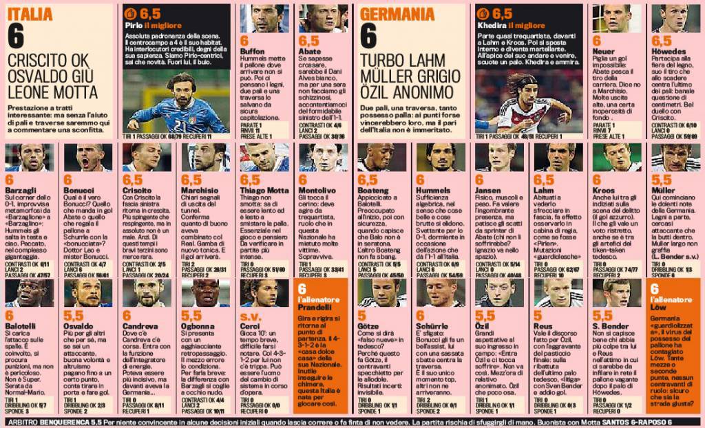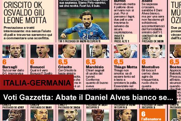 ITALIA GERMANIA VOTI PAGELLE GAZZETTA DELLO SPORT – Di seguito i voti e le pagelle di Italia-Germania firmati Gazzetta dello Sport. L’amichevole di ieri di San Siro si è conclusa con il risultato di 1 a 1, perfetta parità. Molto bene Ignazio Abate che la Rosa definisce, se sapesse anche crossare, il Daniel Alves bianco. Buona prova anche di Montolivo e Balotelli, in netta ripresa rispetto alle ultime uscite con la casacca del Milan. Migliore in assoluto del match è Andrea Pirlo, padrone del centrocampo.