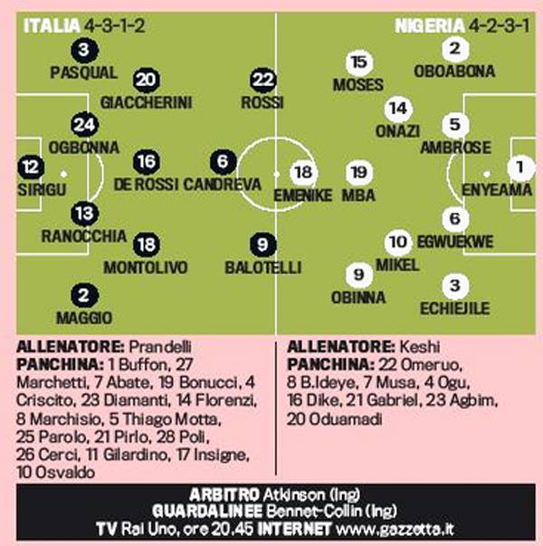 ITALIA NIGERIA PROBABILI FORMAZIONI – Eccovi le probabili formazioni di Italia-Nigeria, gara amichevole che andrà in scena questa sera alle ore 20.45. Sarà l’occasione per vedere all’opera dal primo minuto la coppia azzurra Balotelli-Giuseppe Rossi, quella che dovrebbe guidare la nostra Nazionale in occasione dei Mondiali del 2014. Dietro di loro ci sarà il laziale Candreva mentre Montolivo arretrerà a centrocampo sull’interno di destra al fianco di De Rossi e Giaccherini. In porta andrà Sirigu mentre in difesa spazio al turnover con Maggio e Pasqual sulle due corsie, e Ranocchia e Ogbonna in mezzo.