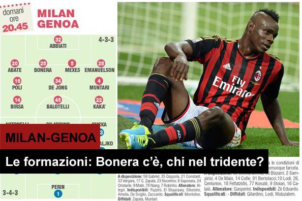 MILAN GENOA PROBABILI FORMAZIONI – Eccovi le probabili formazioni di Milan-Genoa, gara che andrà in scena domani sera alle ore 20.45, in quel dello stadio San Siro. Allegri dovrà fare a meno di Montolivo, squalificato, nonchè di El Shaarawy e De Sciglio, ancora fermi ai box. In attacco sono certi di un posto Balotelli e Kakà e a loro fianco dovrebbe giocare uno fra Birsa e Robinho con il primo leggermente favorito. A centrocampo spazio al trio De Jong, Montolivo, Poli, mentre in difesa potrebbe giocare dal primo minuto Daniele Bonera, al fianco di Mexes.