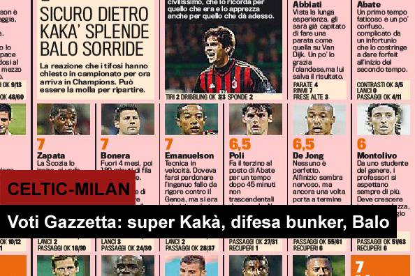 CELTIC MILAN 0-3 VOTI PAGELLE GAZZETTA DELLO SPORT – Pubblichiamo i voti e le pagelle Gazzetta dello Sport di Celtic-Milan. I rossoneri asfaltano gli scozzesi al Celtic Park vincendo con il risultato di 3 a 0. Migliore del match è Ricardo Kakà, autore di un gol e di un match pregevole, conclusosi con la standing ovation del pubblico inglese. Molto bene anche Balotelli, di nuovo in gol, e protagonista finalmente in positivo. Sorprende infine la difesa, un vero e proprio bunker, a cominciare da Zapata, anch’egli in gol nella splendida sera di Glasgow.