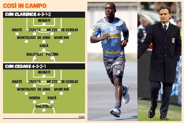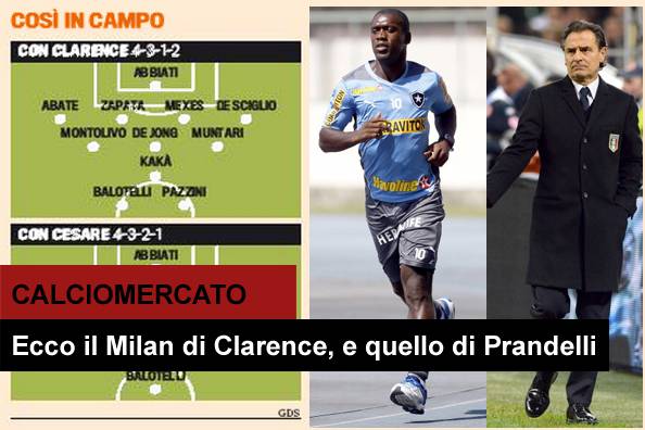 CALCIOMERCATO MILAN – Seedorf in cima alla lista, subito dietro Prandelli. Si giocheranno loro due la panchina del Milan per la stagione 2014-2015, quando Allegri dirà addio e i rossoneri verranno affidati ad una nuova guida tecnica. La Gazzetta dello Sport stamane ha provato ad ipotizzare come potrebbero giocare i due suddetti. Clarence potrebbe puntare su un 4-3-1-2 con Kakà dietro le punte, Balotelli e Pazzini davanti e magari quel ritorno di Pirlo di cui si parla ormai da giorni. Prandelli, invece, confermerebbe di fatto l’albero di Natale di Allegri con Balotelli unica punta supportato alle spalle da Kakà e Honda. In entrambi gli schieramenti manca però El Shaarawy: solo una casualità?