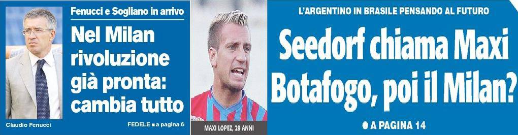 Ecco di seguito i titoli che i quotidiani sportivi Corriere dello Sport e Tuttospot dedicano al Milan nelle loro prime pagine. Ambedue incentrati sui futuri cambiamenti nel club rossonero, che nella prossima stagione potrebbe possedere una nuova dirigenza ed un nuovo allenatore.