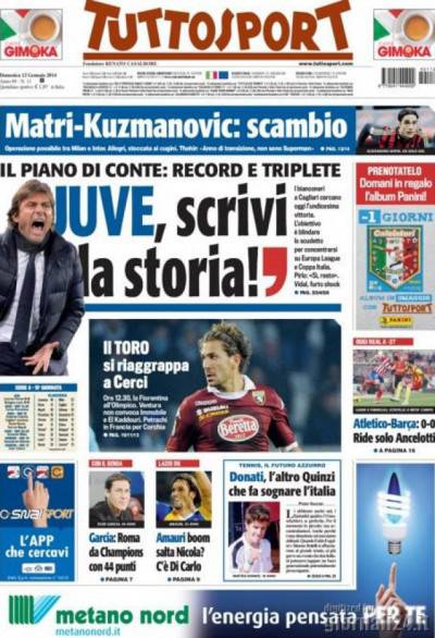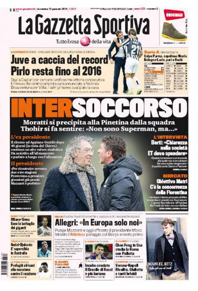 I titoli di Gazzetta, CorSport e Tuttosport: Allegri zittisce Mazzarri, scambio Matri-Kuzmanovic: si può 12/01/2014 - 08:10 di Redazione2 Ecco di seguito riportate le prime pagine de La Gazzetta dello Sport, Corriere dello Sport e di Tuttosport che danno risalto alla gara di oggi tra Sassuolo e Milan ed ai soliti rumors di calciomercato.
