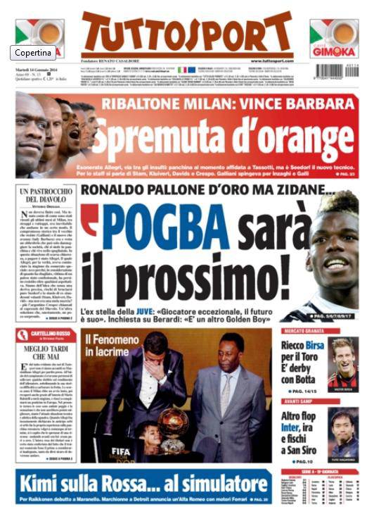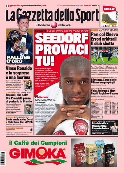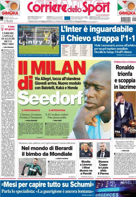 Ecco le prime pagine dei principali quotidiani sportivi italiani che dedicano un importante spazio al Milan e all’evoluzione della situazione dopo l’esonero di Massimiliano Allegri. Clarence Seedorf ormai designato successore e con lui potrebbero esserci importanti novità. Sancita la vittoria di Barbara Berlusconi su Adriano Galliani.