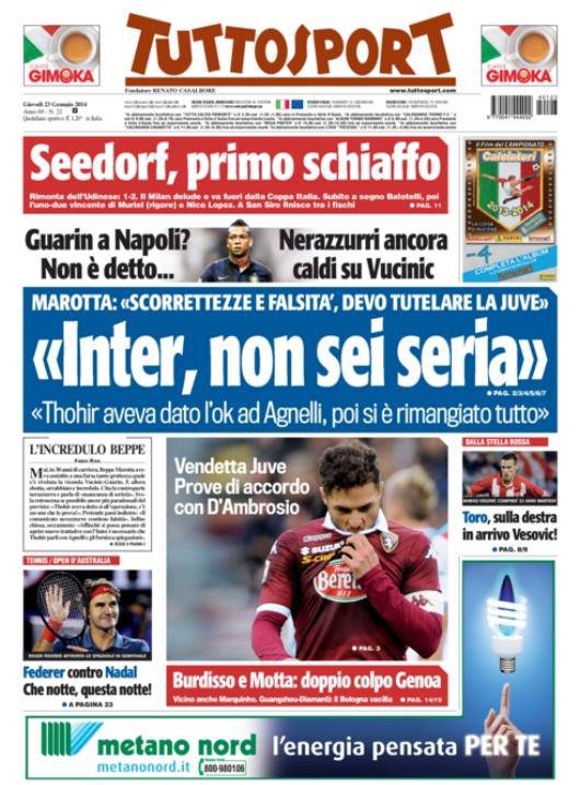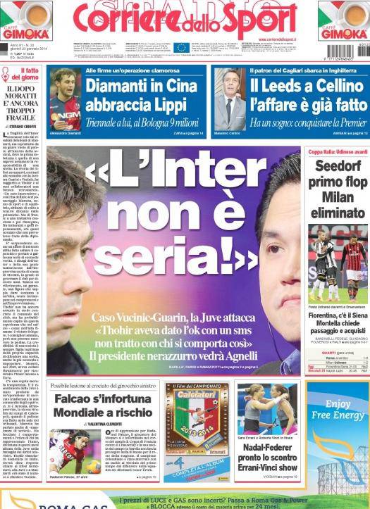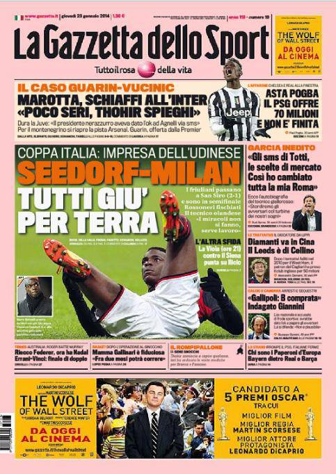 Vi riportiamo di seguito le foto delle prime pagine dei tre principali quotidiani sportivi italiani (Gazzetta dello Sport, Corriere dello Sport, Tuttosport) che dedicano uno spazio importante all’eliminazione del Milan dalla Coppa Italia per mano dell’Udinese, primo passo falso per il nuovo allenatore Clarence Seedorf.