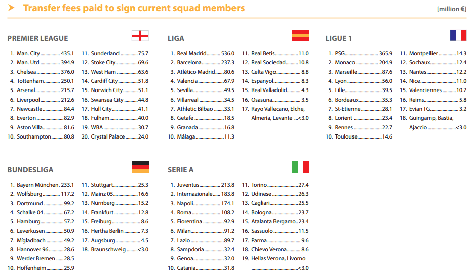 Riportiamo di seguito la classifica per campionati dei soldi spesi complessivamente da ciascun club per costruire le squadre attuali.