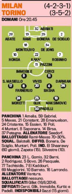 Milan-Torino, probabili formazioni: Abate e Pazzini tornano titolari 31/01/2014 - 15:20 di Matteo B. Ecco di seguito la grafica con le probabili formazioni di Milan e Torino, che si affronteranno domani sera alle ore 20.45 a San Siro. Nei rossoneri torneranno titolari Abate e Pazzini. Balotelli è squalificato.