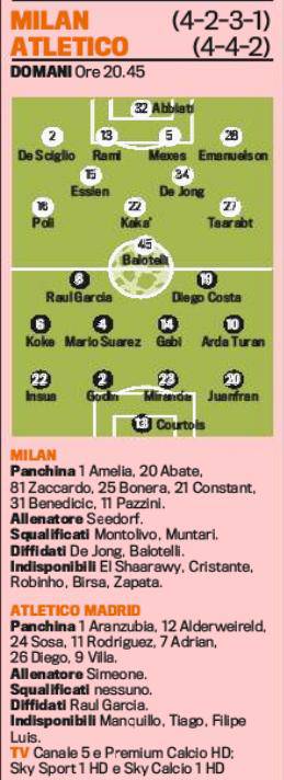 Al centro della difesa accanto a Rami dovrebbe giocare Mexes. A centrocampo ci sarà una diga composta da Essien e da De Jong. In attacco nel tridente alle spalle di Balotelli dovrebbe trovare spazio Poli vicino a Kakà e a Taarabt.
