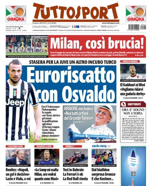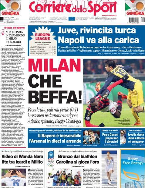 Ecco di seguito le foto delle prime pagine dei tre principali quotidiani sportivi italiani: La Gazzetta dello Sport, Corriere dello Sport e Tuttosport. Ampio spazio dedicato alla sconfitta del Milan nell’andata degli ottavi di finale contro l’Atletico Madrid a San Siro.