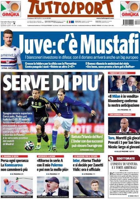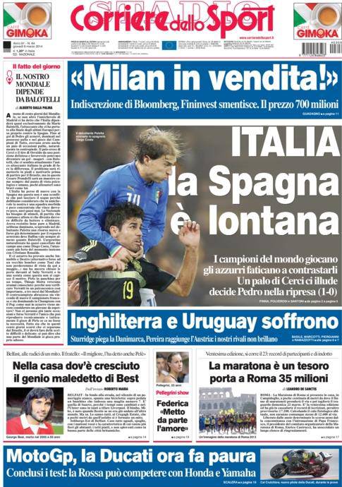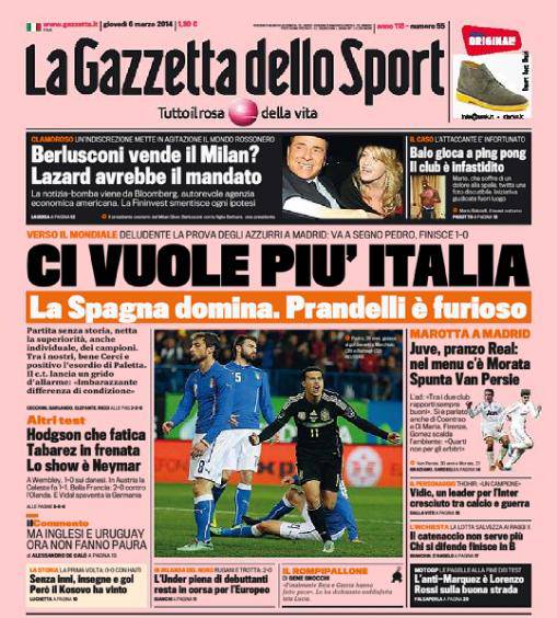 Ecco di seguito le foto delle prime pagine de La Gazzetta dello Sport, Corriere dello Sport e Tuttosport che danno ampio spazio alla sconfitta dell’Italia contro la Spagna nell’amichevole di Madrid e alla voce di cessione del Milan da parte di Silvio Berlusconi.