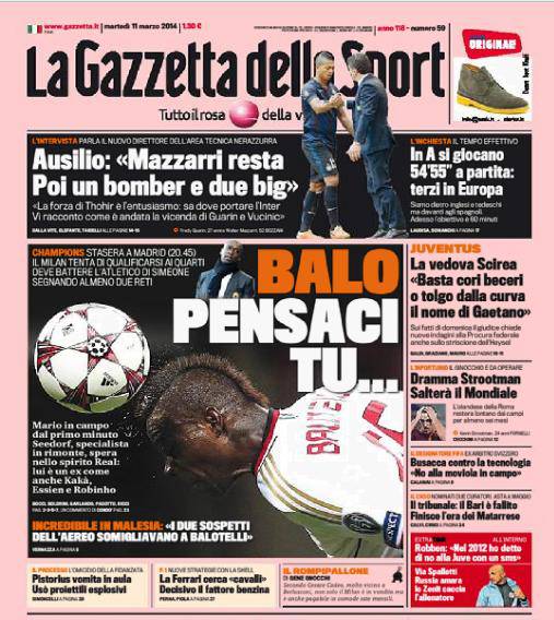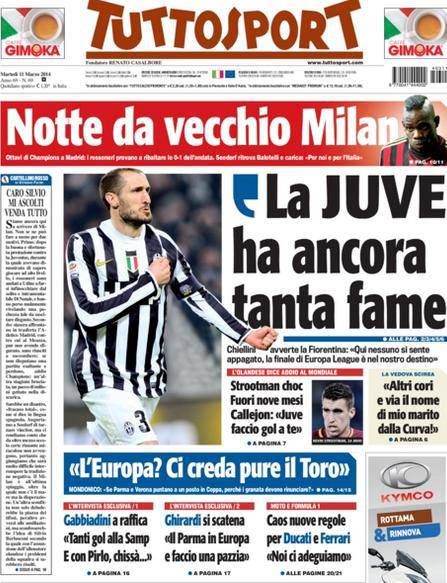 Ecco di seguito le foto delle prime pagine de La Gazzetta dello Sport, del Corriere dello Sport e di Tuttosport che dedicano ampio spazio alla partita Atletico Madrid-Milan di questa sera, valida per il ritorno degli ottavi di finale di Champions League.