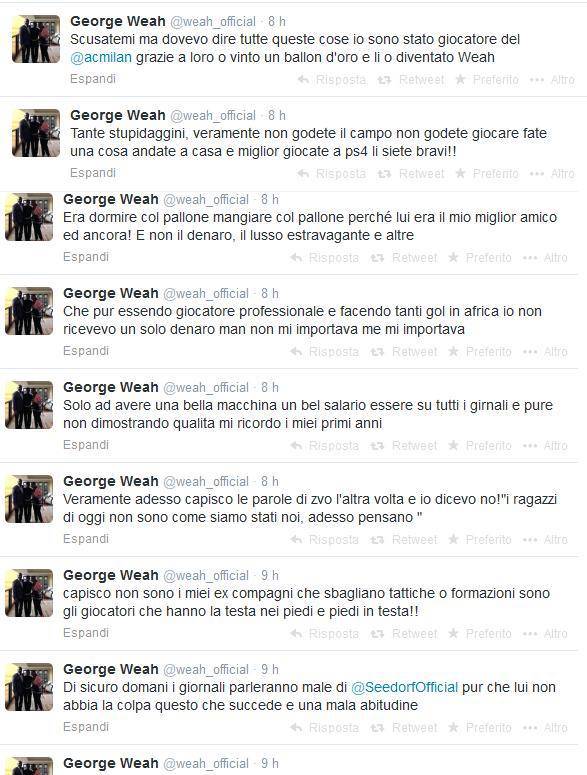 Milan, Weah si sfoga su Twitter: “I giocatori hanno la testa nei piedi e i piedi in testa” 12/03/2014 - 12:40 di Keivan Karimi TWITTER WEAH – Vi proponiamo lo sfogo da tifoso verace del Milan dell’ex stella rossonera George Weah, che sul suo profilo Twitter dopo la sconfitta di ieri a Madrid se l’è presa con i calciatori e con chi critica Clarence Seedorf:
