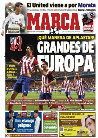 ATLETICO MILAN – Grande euforia in Spagna per il 4-1 inflitto dall‘Atletico Madrid ieri sera al Milan, che sancisce la netta superiorità dei colchoneros e li lancia direttamente ai quarti di finale di Champions League tra le migliori otto squadre europee. Vediamo come aprono i quotidiani spagnoli stamane elogiando la vittoria dei madrileni: